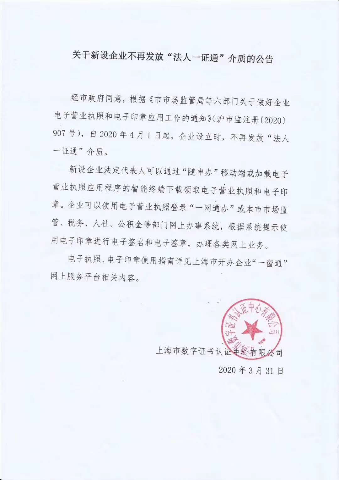 关于新设企业不再发放“法人一证通“”介质公告