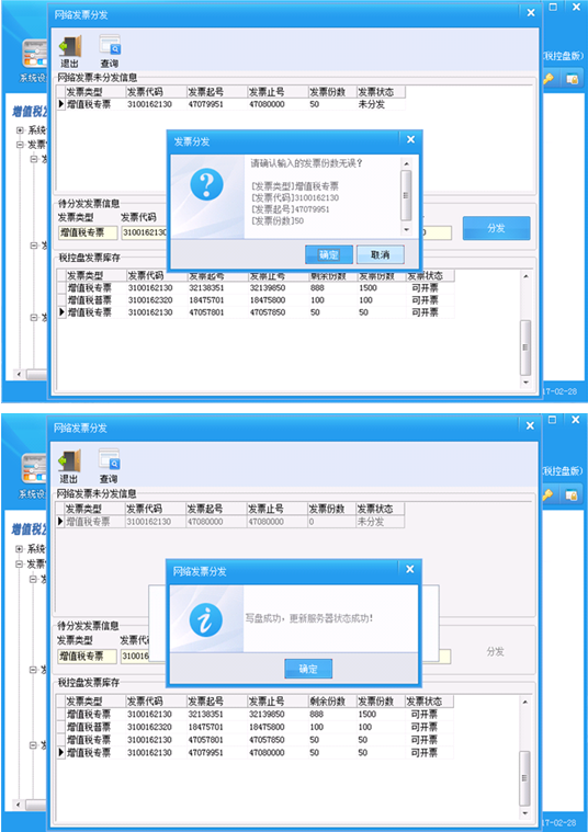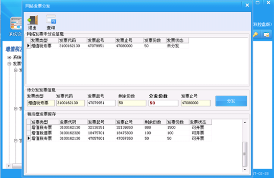 2.弹出网络发票分发窗口后直接点击 “查询”按钮,查出纳税人所有的未分发的及待分发的网络发票,同时查询税控盘中的发票库存信息。单击想要分发的发票,然后在“待分发发票信息”框中输入想分发的份数,不能超过剩余份数,分发份数不能为零;点击“分发”按钮进行分发操作。