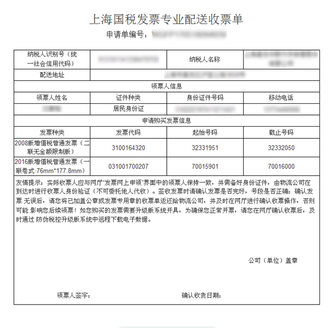 纳税人核对配送发票信息一致完成物流签收手续、登录网上办税服务厅已对领票结果确认为“已办结(通过)”。