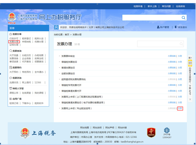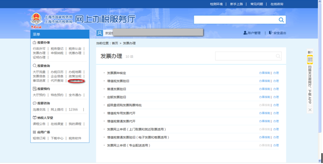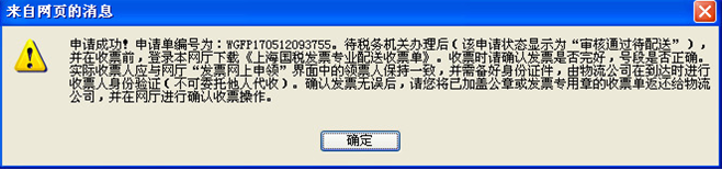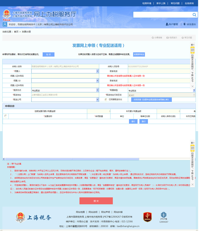 网上办税服务厅——发票办理——发票网上申领(专业配送适用)