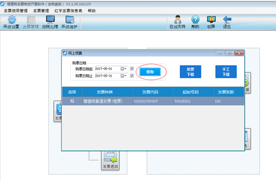 2.选择购票日期,点击查询,根据查询结果,选择需要写盘的号码段,点击发票下载,确认信息无误后,点击确定,即完成发票写盘。