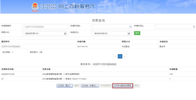 第二步:选择完某条记录后 纳税人可以查看到发票配送申请状态,待税务机关完成审核并发售发票后,“打印专业配送收票单”按钮有效,点击“打印专业配送收票单”跳转到专业配送收票单页面,点击“打印收票单”按钮打印专业配送收票单。配送收票单加盖公章或发票专用章,核对并签收发票后返回给物流公司。