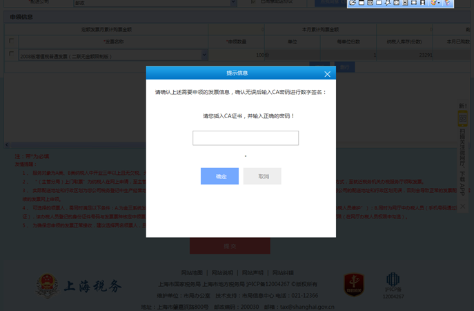 确认上述需要申领的发票信息无误后输入CA密码进行数字签名。