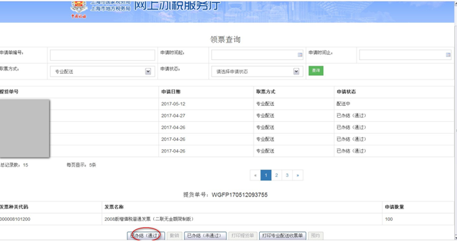 第二步:选择完某条记录后 纳税人可以在页面底部对该领票记录做相应处理,对于配送收票单信息同纸质发票信息核实一致的,选择“已办结(通过),至此该事项完毕;对于配送收票单信息同纸质发票信息不一致的,纳税人选择”已办结(不通过),凭物流公司出具的“拒收发票证明单”、“上海国税发票专业配送收票单”、税控开票设备至办税服务厅处理。