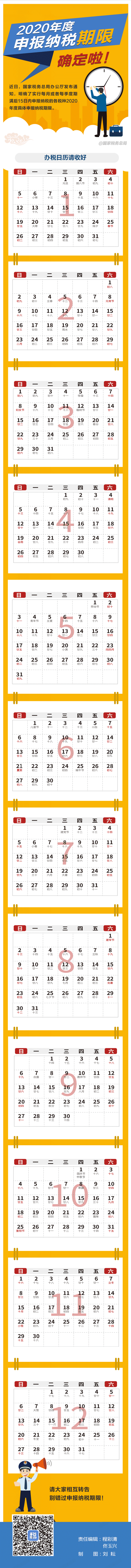近日,国家税务总局办公厅发布《关于明确2020年度申报纳税期限的通知》(税总办函〔2019〕449号),明确了实行每月或者每季度期满后15日内申报纳税的各税种2020年度具体申报纳税期限。为了方便纳税人每月查找办税日期,一张动图送给你!快收藏起来吧~