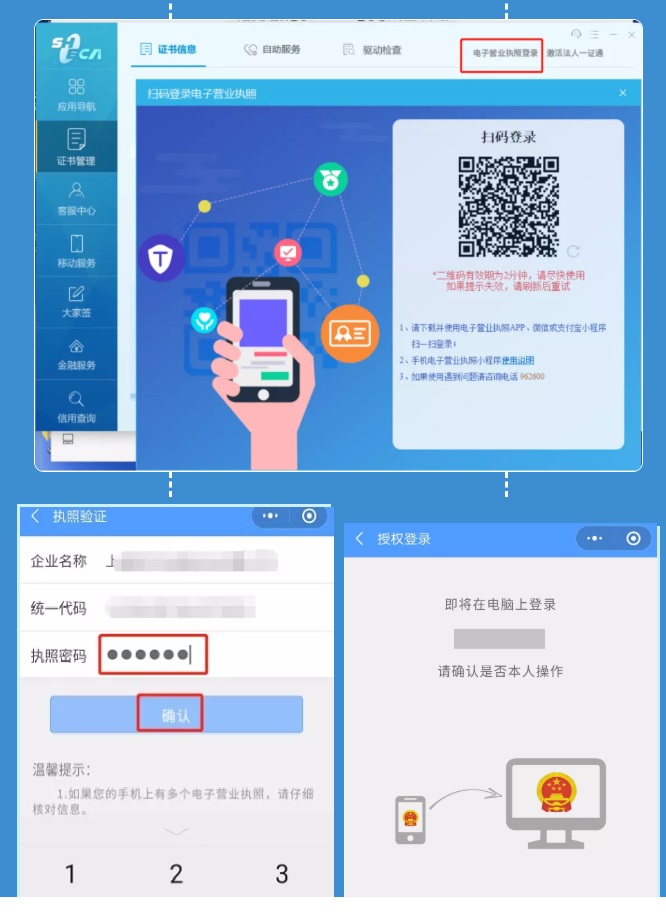 选择电子营业执照并输入电子营业执照密码,点击“确认登录”按钮。