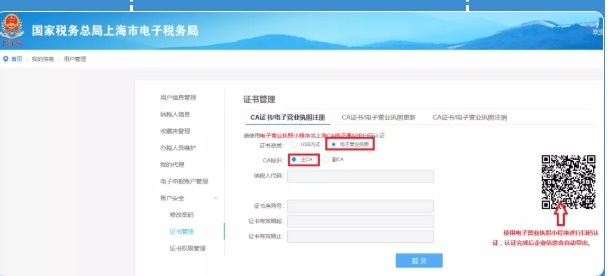 3电子税务局登录成功后,按照“我的信息---用户管理---证书管理”路径进入CA证书/电子营业执照注册界面,将证书资质选择至“电子营业执照”,并根据实际需求确认主副CA标识。