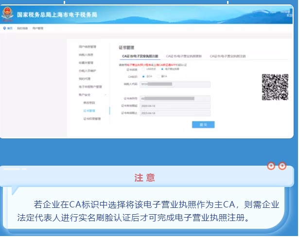 若企业在CA标识中选择将该电子营业执照作为主CA,则需企业法定代表人进行实名刷脸认证后才可完成电子营业执照注册。