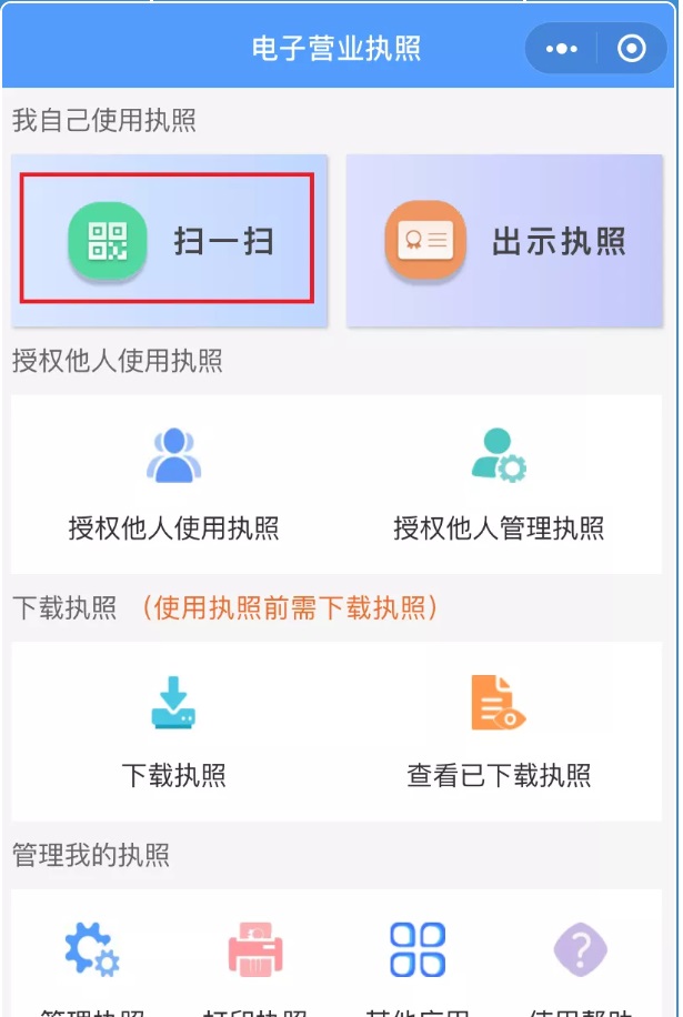 2在登录界面弹出的二维码中,使用电子营业执照APP或小程序进行扫码认证,点击“扫一扫”。