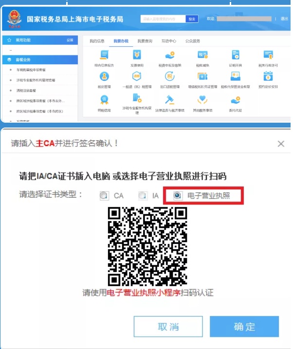 1已完成电子营业执照申请的纳税人,需在上海市数字证书认证中心官网下载安装最新版本协卡助手,安装成功后进入协卡助手客户端,点击右上角“电子营业执照登录”,使用手机端电子营业执照APP或小程序进行扫码认证。