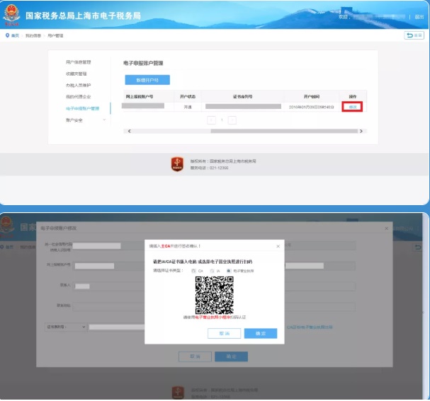 3如需修改电子申报账户信息,则可通过点击该账户右侧“修改”按钮,完成修改后进行签名提交。